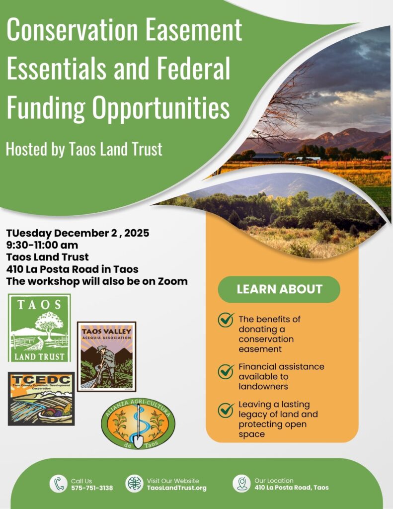 Join us on Tuesday, December 2, 2025, from 9:30 to 11:00 am at the Taos Land Trust, 410 La Posta Road, or from the comfort of your home via Zoom. The workshop will cover the benefits of donating conservation easements, available financial assistance, and how you can leave a lasting legacy protecting open space in our community.